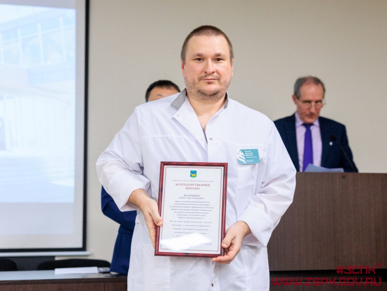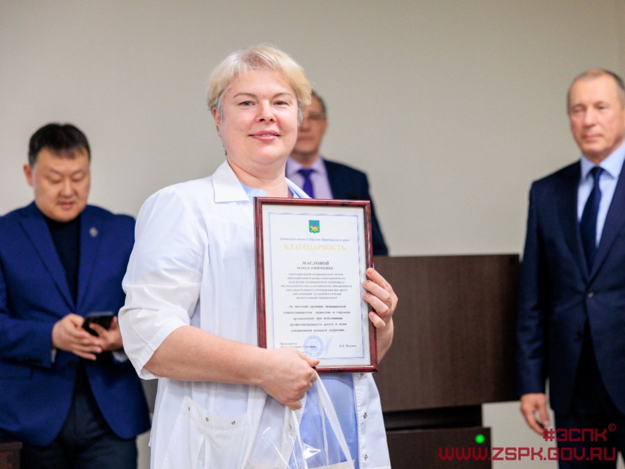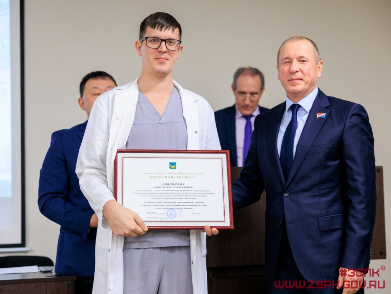 Почетными грамотами и благодарностями Законодательного Собрания края награждены медицинская сестра Алена Пирог, сердечно-сосудистый хирург Александр Левицкий и операционная медицинская сестра Олеся Маслова. Благодарственными письмами отмечены еще 20 сотрудников Медицинского центра ДВФУ.