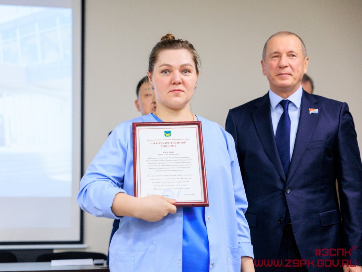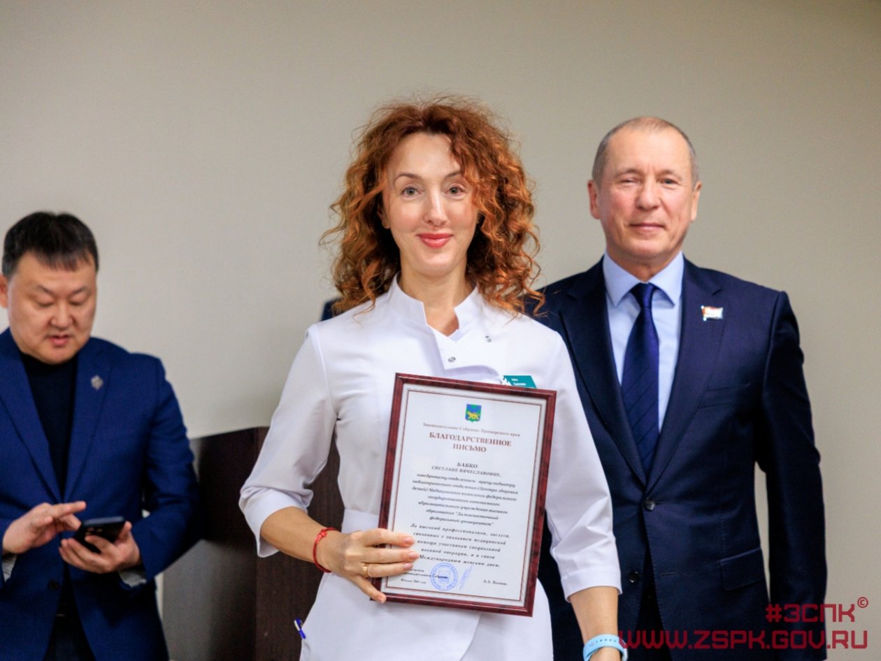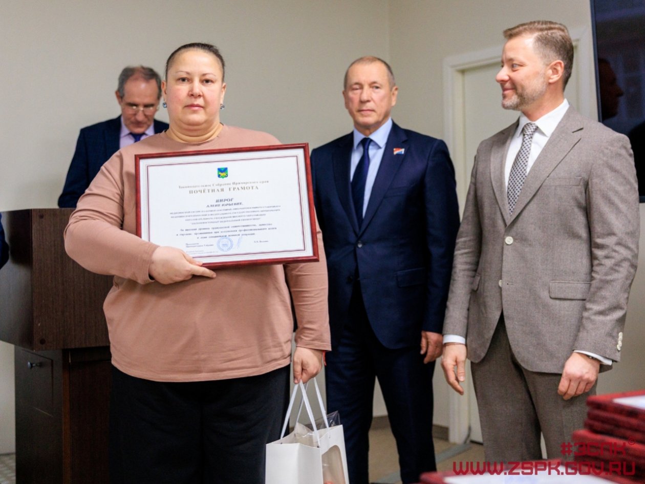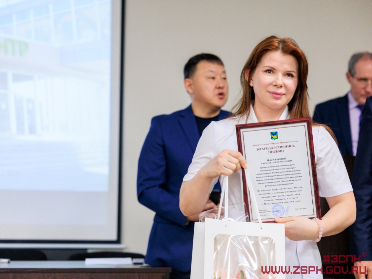 Почетными грамотами и благодарностями Законодательного Собрания края награждены медицинская сестра Алена Пирог, сердечно-сосудистый хирург Александр Левицкий и операционная медицинская сестра Олеся Маслова. Благодарственными письмами отмечены еще 20 сотрудников Медицинского центра ДВФУ.