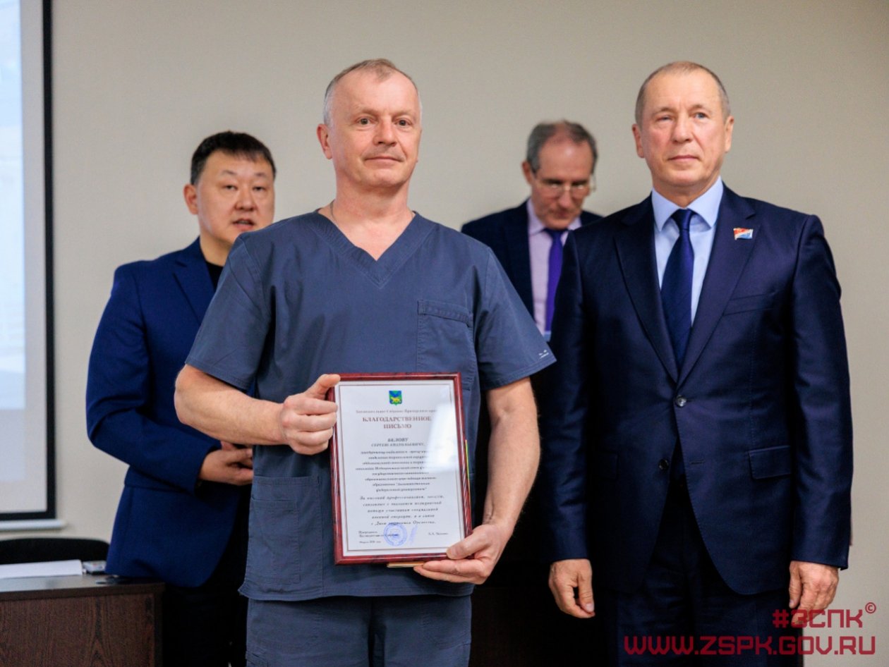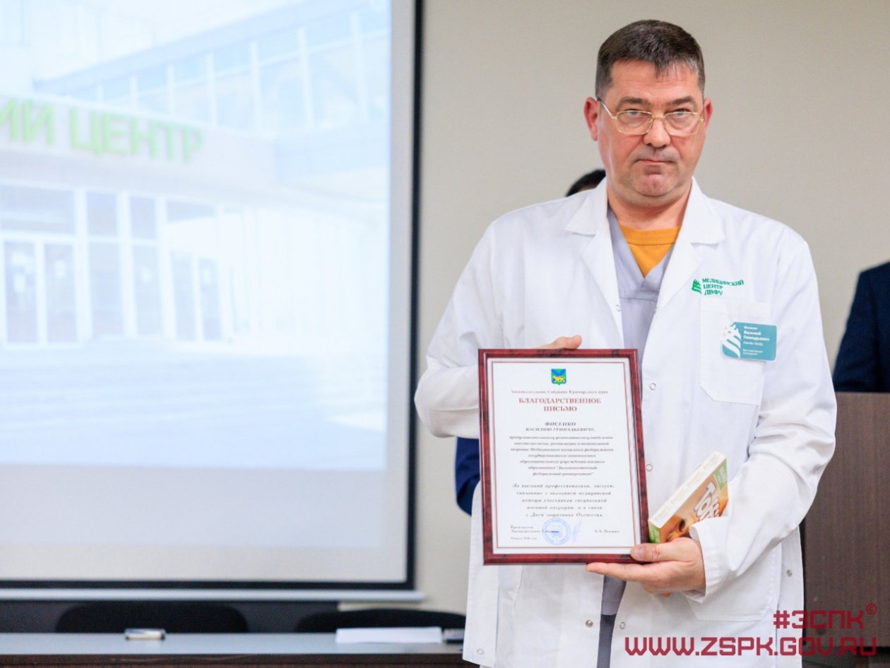 "Глава приморского парламента от всего сердца поблагодарил за самоотверженный, нелегкий труд медицинских работников Медцентра ДВФУ, которые принимали участие в специальной военной операции. У многих за плечами несколько командировок в зону СВО", — говорится в сообщении.