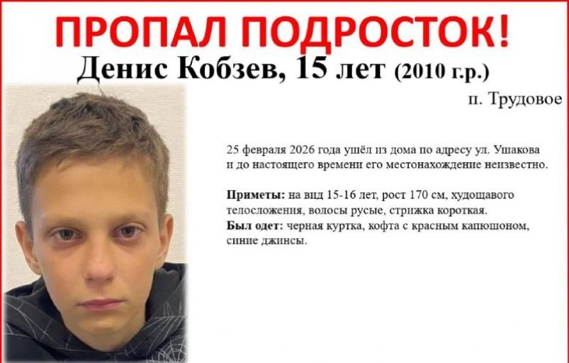 Приметы пропавшего: на вид 15-16 лет, рост 170 см, худощавого телосложения, волосы русые, стрижка короткая.