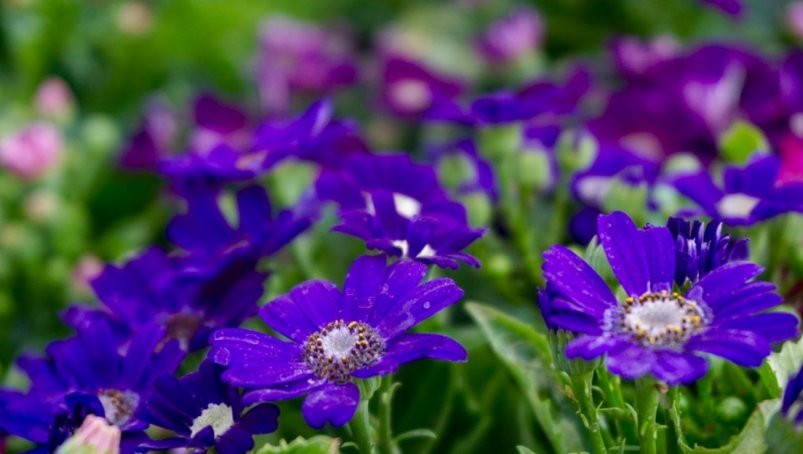 - виола. Интересная культура с белыми, желтыми, фиолетовыми, синими или черными цветами с пятнами, полосками, переходами. Цветет долго, а если посеять ее осенью, то она расцветет на участке практически самая первая.
