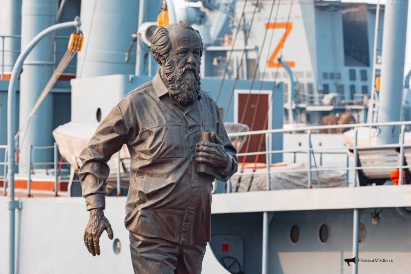 Бронзовая скульптура авторства Петра Чегодаева высотой 2,5 метра была установлена на Корабельной набережной напротив подводной лодки С-56 в сентябре 2015 года. Фигура создана в память о пребывании во Владивостоке писателя, публициста, общественного и политического деятеля, лауреата Нобелевской премии по литературе Александра Исаевича Солженицына в мае 1994 года. После долгих лет изгнания он вернулся в Россию из США, и первым российским городом, куда прибыл писатель, стал Владивосток. Здесь во время своего визита он побывал на митинге, встретился со студентами ДВГТУ, представителями власти и общественных организаций.