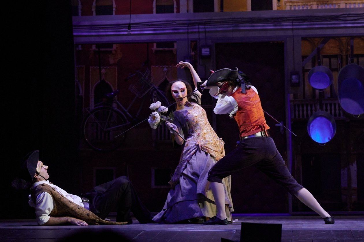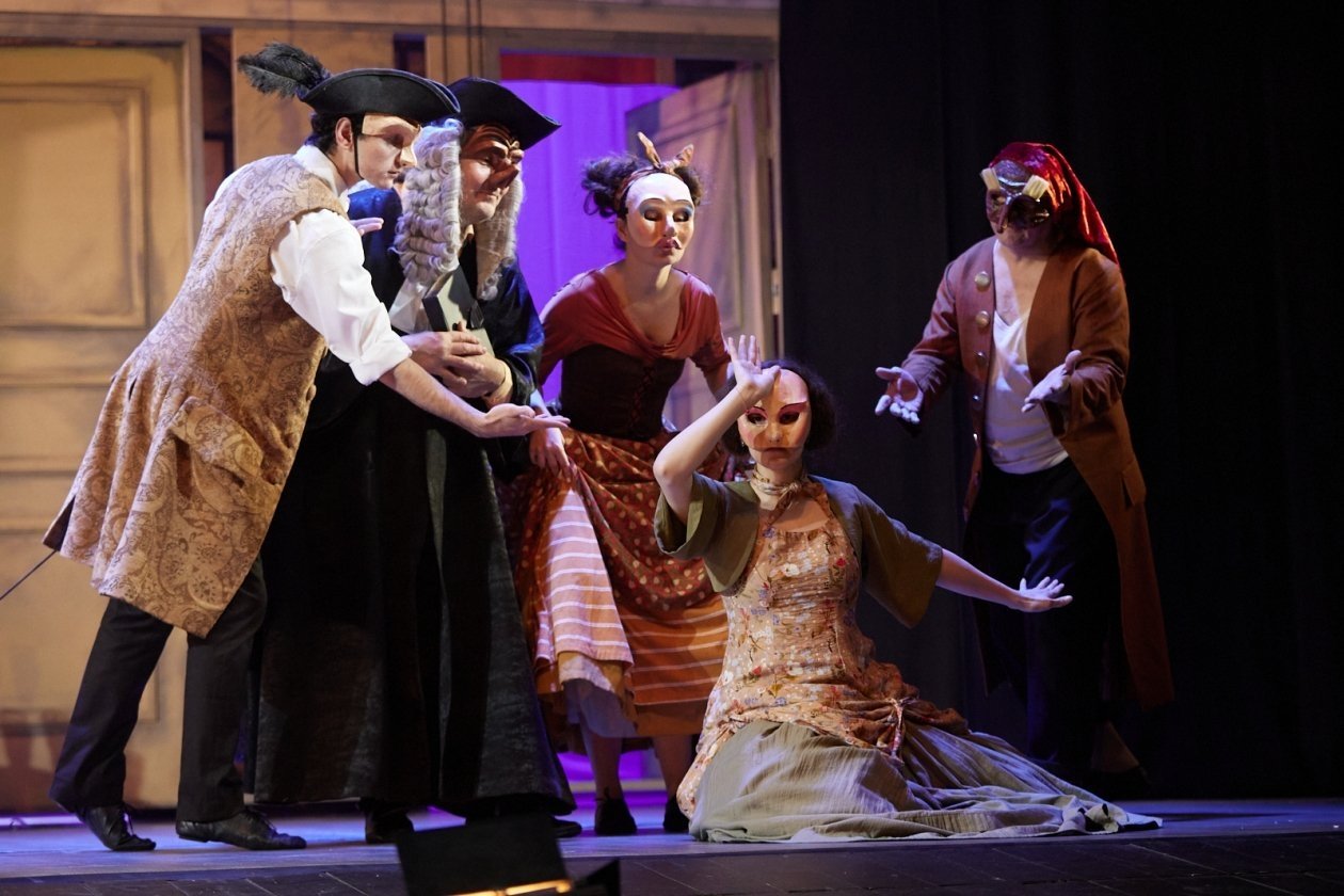 И вот Владивосток. 2024 год. Попытка примирить Гольдони и Гоцци, соединить их эстетики. Герои Гольдони надевают маски театра комедии дель арте, актеры передвигаются по сцене и делают жесты в той самой манере, в которой это делали их далекие предшественники в середине XVIII века в Италии. Для того, чтобы зрелище получилось максимально правдоподобным, на постановку в качестве специального педагога был приглашен актер Электротеатра Станиславский (Москва) Дмитрий Мягкий, владеющий техникой комедии дель арте. И спектакль, что называется, выстрелил, явив нам вид завершенности многовекового спора двух великих комедиографов.