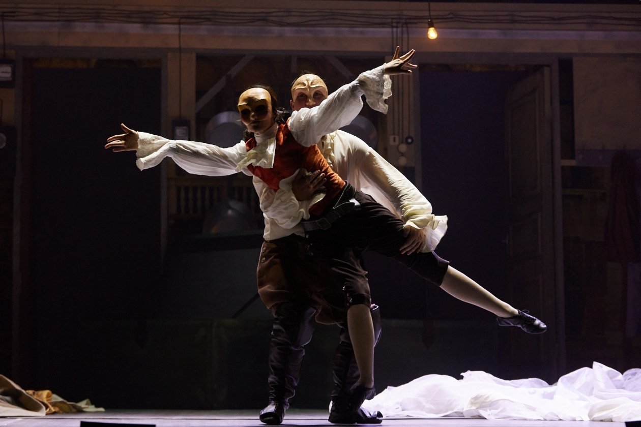И вот тогда комедия дель арте, которую играют актеры на сцене, становится возможностью немножко оторваться от приземленного понимания жизни и подняться высоко вверх.