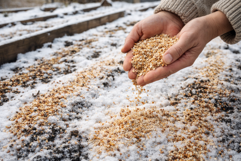 Один из способов — рассыпать по снегу органические добавки и крупы. Когда снег начнёт таять, он будет постепенно увлажнять почву и переносить органику в верхний слой грунта. Таящий снег действует как естественный полив. Вода равномерно пропитывает землю и помогает органическим веществам проникать в почву.