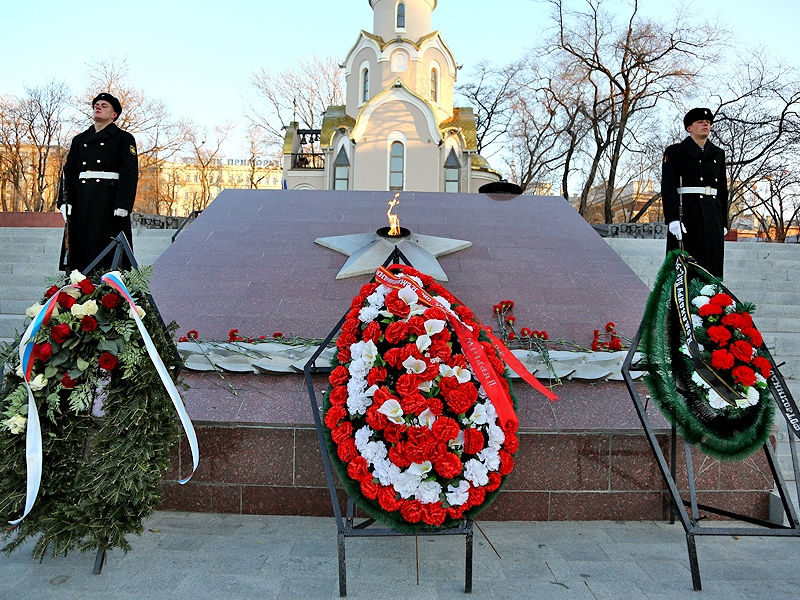 Торжественная церемония возложения цветов и венков к Вечному огню мемориала "Боевая с. Фото: Автор: Администрация города Владивостока