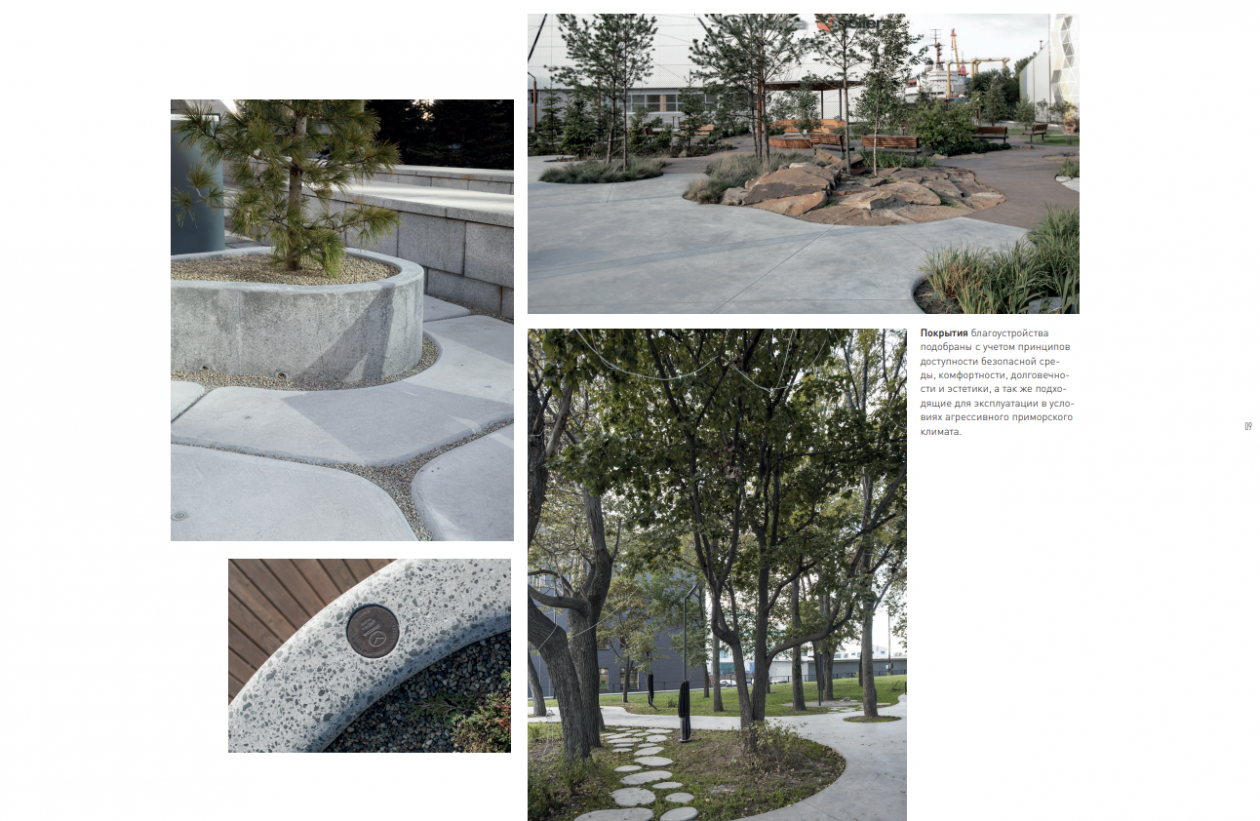 Территория парка Минного городка и участок, отданный под КРТ, будут соединены бесшовно. Как отметил Машков, визуально и функционально это станет единым пространством. Покрытие на всей территории подбирается по принципам доступности, долговечности, эстетики и с учётом особенностей приморского климата.