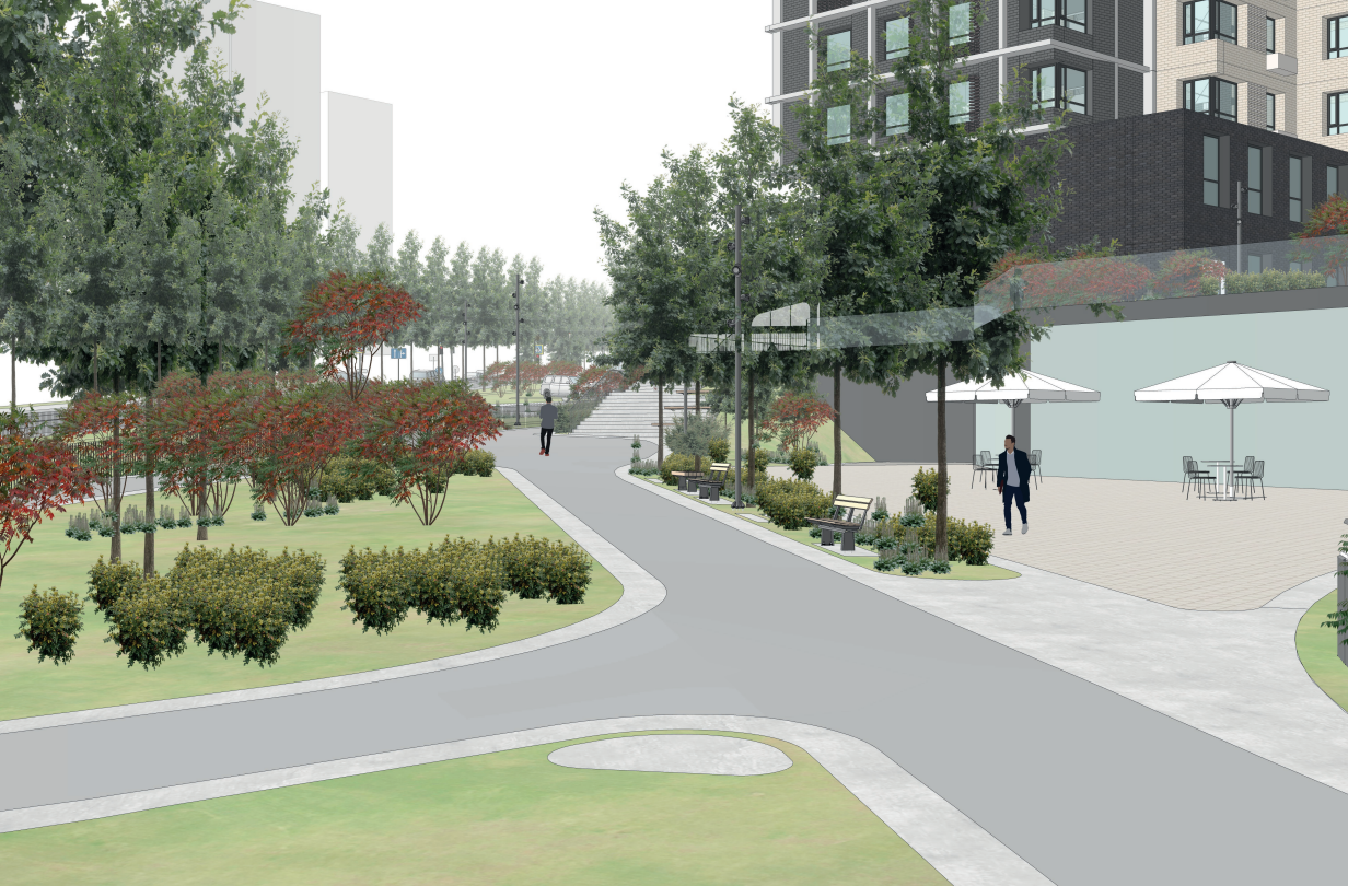 Особое внимание в концепции уделено территории вокруг трамвайных путей и входной группе парка Минного городка, которые должны "влиться" в единое пространство. Как пояснил архитектор, из-за высокой пешеходной проходимости ключевая задача проектирования здесь — оформить все маршруты максимально безопасно и комфортно.