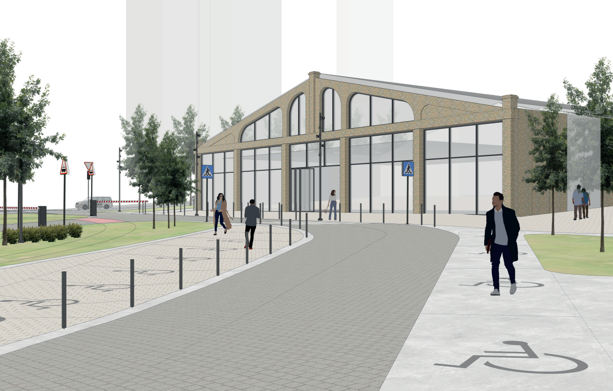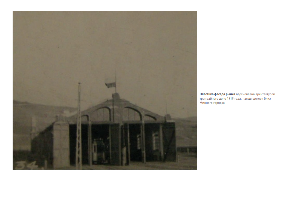 Из появившейся концепции становится понятно, что пластика фасада рынка вдохновлена архитектурой трамвайного депо 1919 года, которое как раз находилось недалеко от парка Минного городка. Создатели концепции — команда Concrete Jungle — делают акцент на трамвайном движении как неотъемлемой части прошлого и настоящего города.