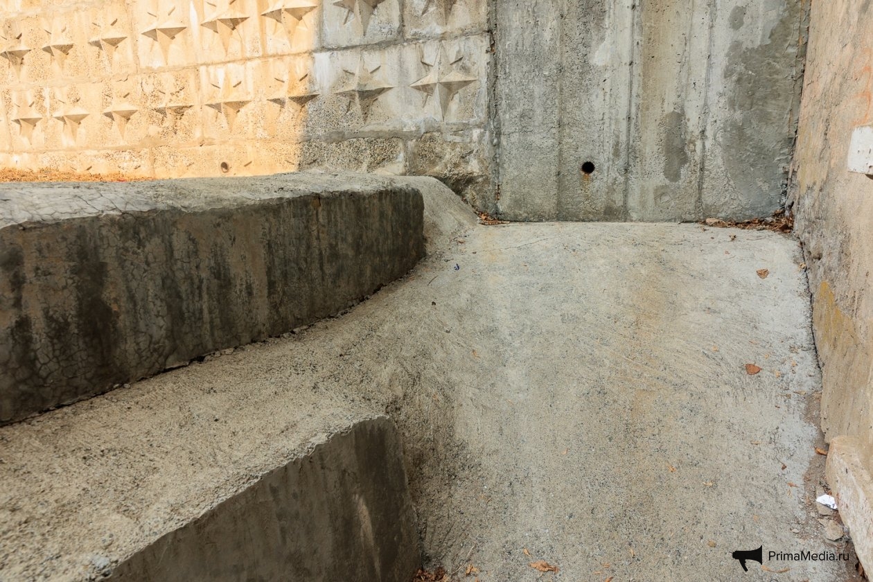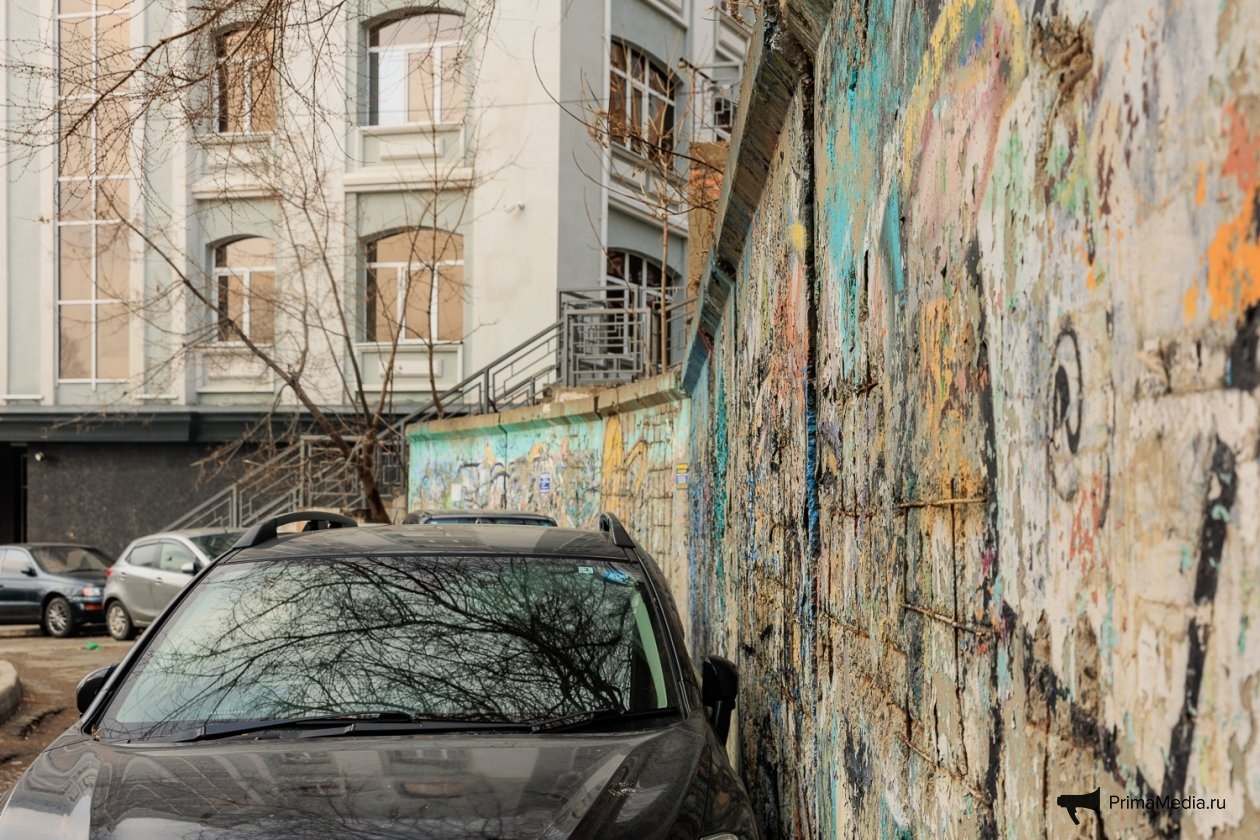 Иная, но тоже вызывающая опасения картина наблюдается в районе пр. Красного Знамени, 137, где трещины "прорезают" бетонные плиты. Хотя пока они не столь критичны, как на предыдущем участке, местами бетон все же начал крошиться. Ситуацию усугубляет то, что вплотную к стене паркуются автомобили, что в случае дальнейшего разрушения может предоставлять угрозу.