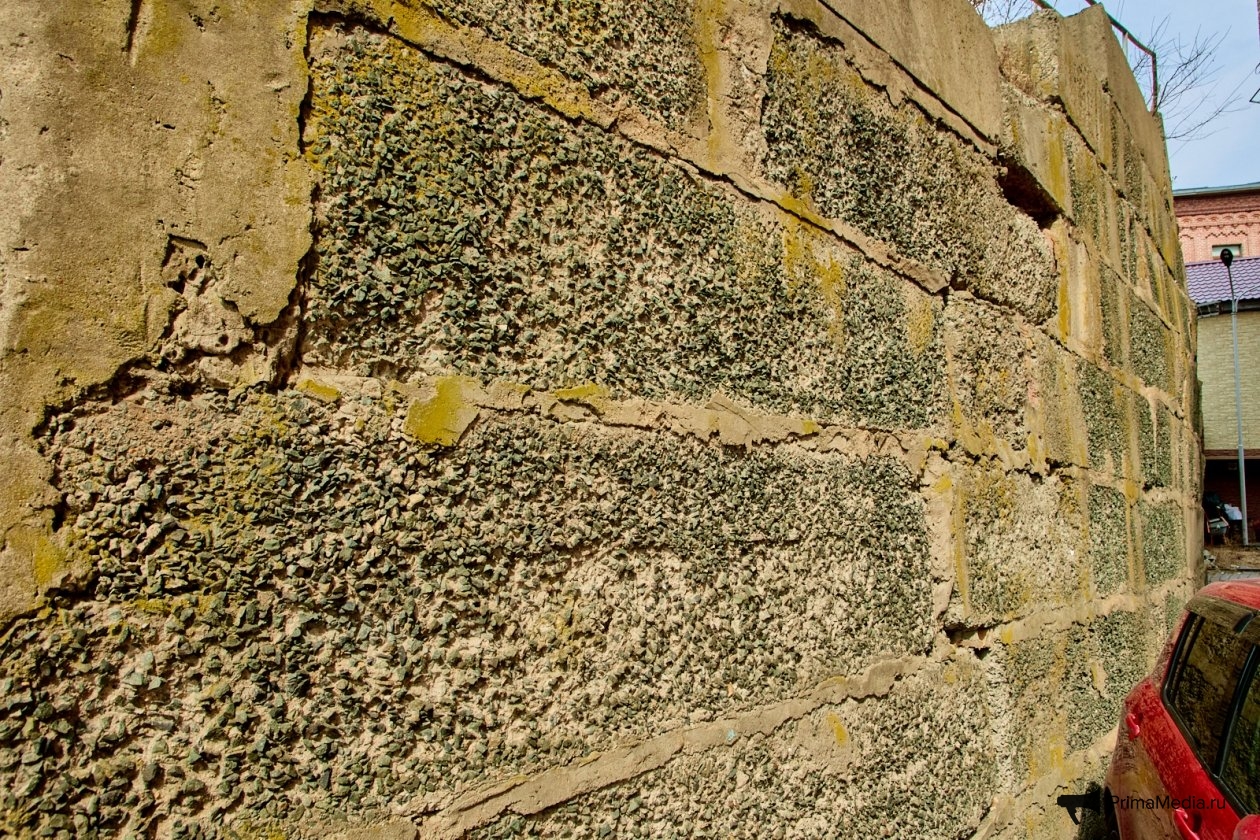 По адресу Корнилова, 8, который тоже есть в списке, подпорная стена небольшая и проходит по периметру дома. Однако и тут кладка местами разрушена. К слову, щели здесь настолько широкие, что спокойно помещается бутылка, что мы можем увидеть на одной из фотографий.