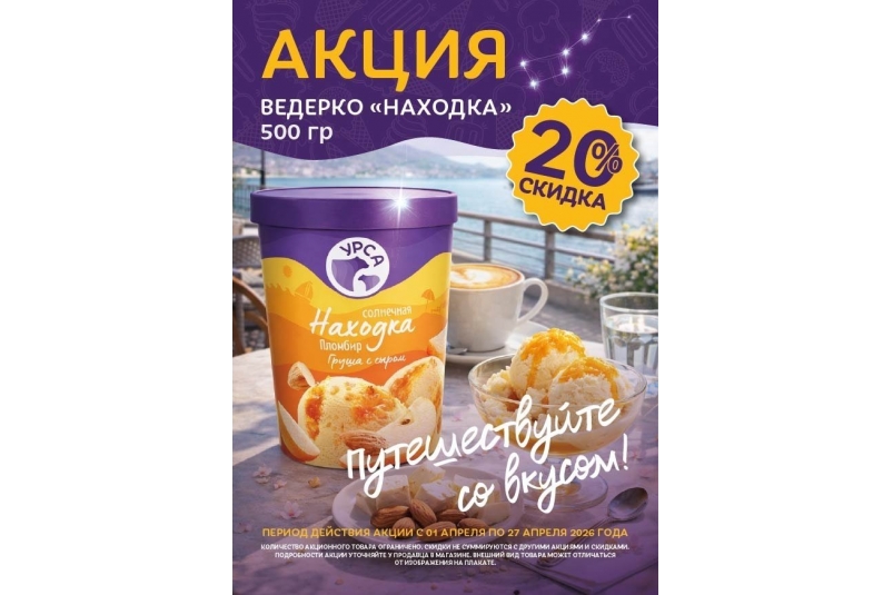 PrimaMedia, 26 марта. Фабрика мороженого "УРСА" запускает весеннюю акцию на ведёрко мороженого "Находка" 500 грамм. С 1 по 27 апреля 2026 года покупатели смогут приобрести продукт со скидкой 20% во всех городах присутствия, сообщает пресс-служба Фабрики мороженого "УРСА".