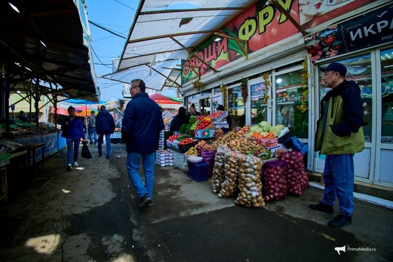 Однако продовольственный рынок работает в полном объёме. Здесь много овощей и фруктов, а цены, традиционно одни из самых низких в городе. Это притягивает людей. Даже в будние дни здесь полно народу.