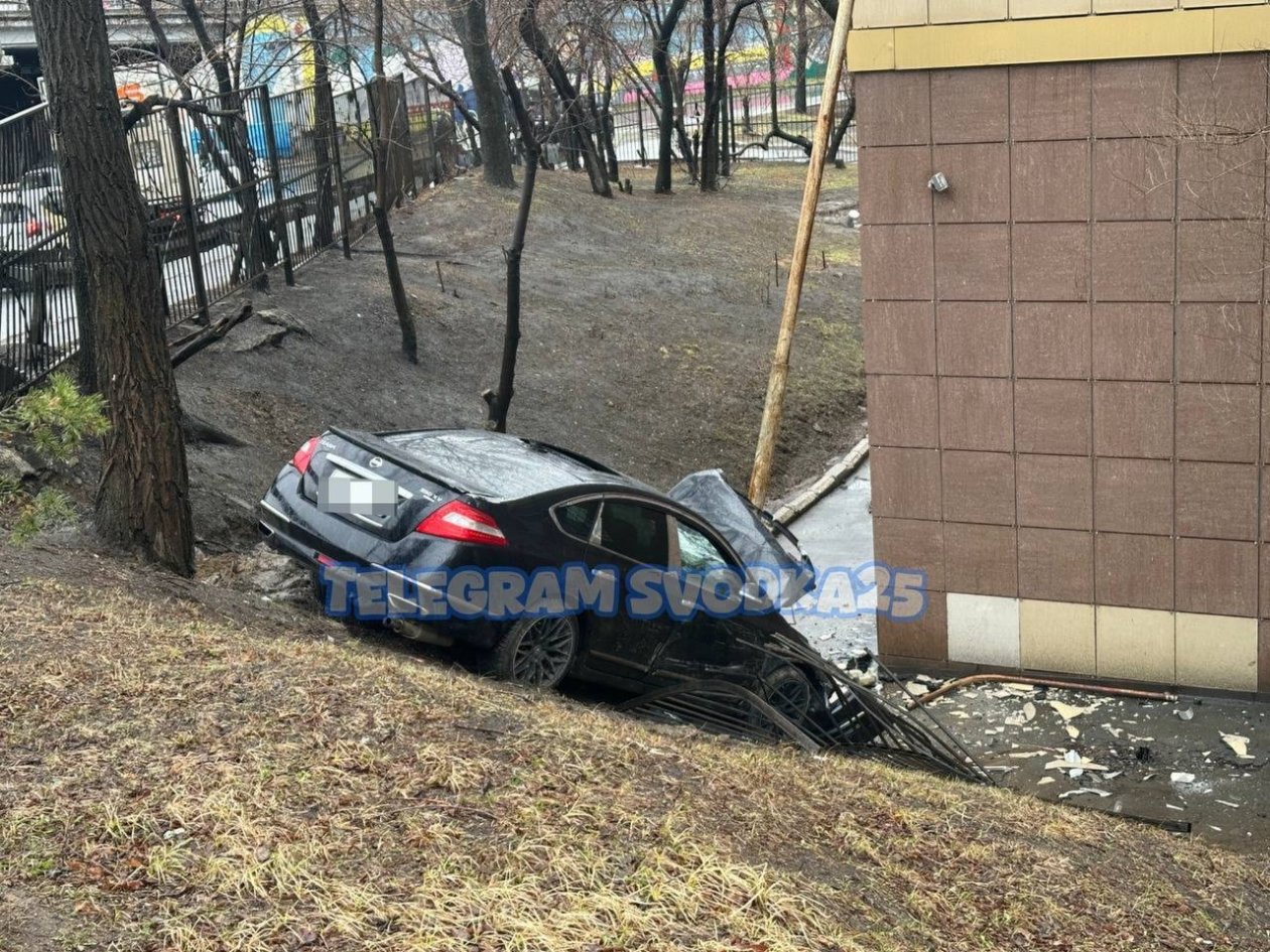 PrimaMedia, 11 апреля. Автомобиль столкнулся с Toyota Yaris в районе школы №38, на проспекте Столетия, 29а во Владивостоке. Nissan Teana отлетел в леера, после чего пробил забор и скатился с косогора на школьную территорию, сообщают городские паблики.