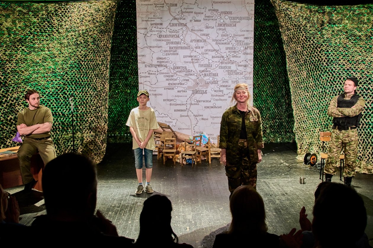 Так начинается спектакль. Сюжет очень прост и непритязателен. Ополченку ДНР, участвующую в трехмесячной обороне Славянска, который пришлось оставить, захватили в плен. И вот теперь молодой офицер СБУ (признано в России террористической организацией) допрашивает ее: "Фамилия. Имя. Отчество. Номер части. Должность. Цель проникновения в наш тыл". Это его первый допрос и поэтому "он старательно прячет мальчишку под нахмуренными бровями и так же старательно басит" (ремарка из пьесы).
