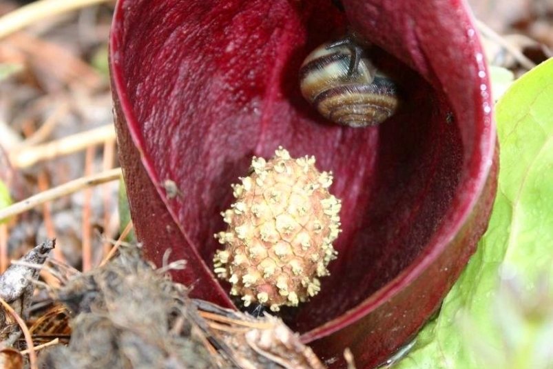 Как рассказали в нацпарке, симплокарпус цветёт ранней весной, бросая вызов холоду благодаря уникальному свойству — термогенезу. Соцветие выделяет тепло, постепенно растапливая окружающий снег. Этот тепловой эффект не только помогает растению прорасти, но и усиливает распространение его характерного запаха. Аромат цветков резкий, напоминающий секрет скунса, поэтому это растение в англоговорящих странах известно под названием skunk cabbage ("скунсовая капуста"). Такая особенность является стратегией привлечения первых насекомых-опылителей.
