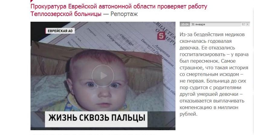В эфире "Пятого канала" вышел репортаж Даниила Горчакова из Облученского района Еврейской автономной области, где в п. Биракан в первый день нового года от гнойного отита и пневмонии умерла маленькая Виолетта. Ее мама трижды вызывала фельдшера скорой помощи, но медик оценил состояние ребенка как "не требующее госпитализации", сообщает корр. РИА ЕАОmedia.