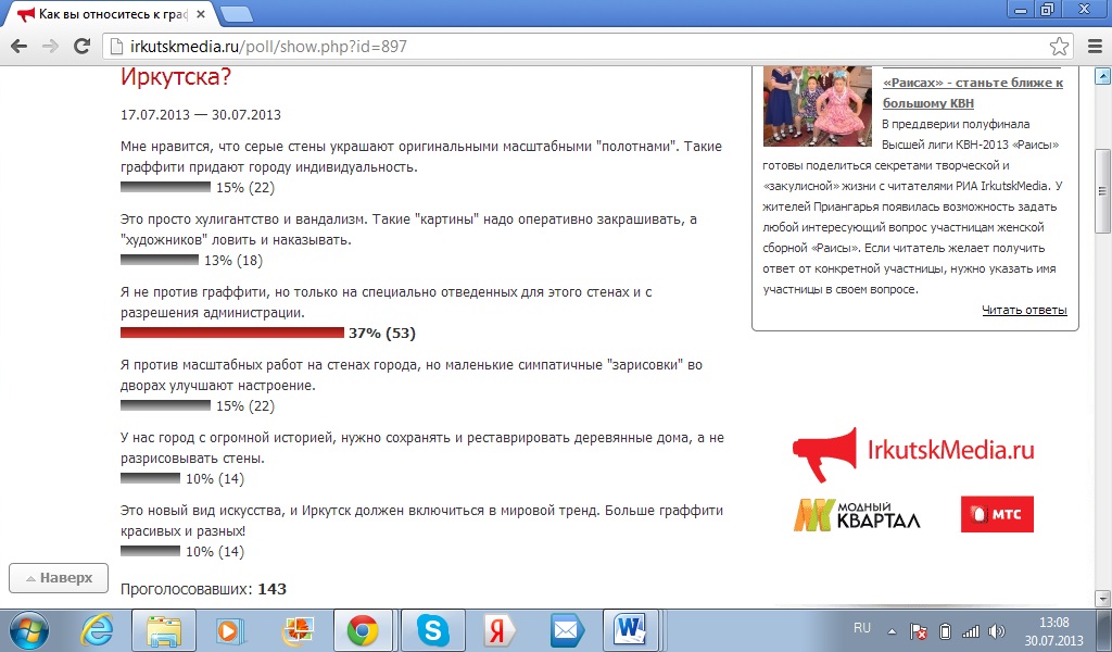 Ничего не имеют против граффити жители Иркутска и Иркутской области. Однако наноситься рисунки должны на поверхности в специально отведенных для этого местах и с разрешения администрации. Так считает большинство проголосовавших в опросе, проведенном РИА IrkutskMedia.