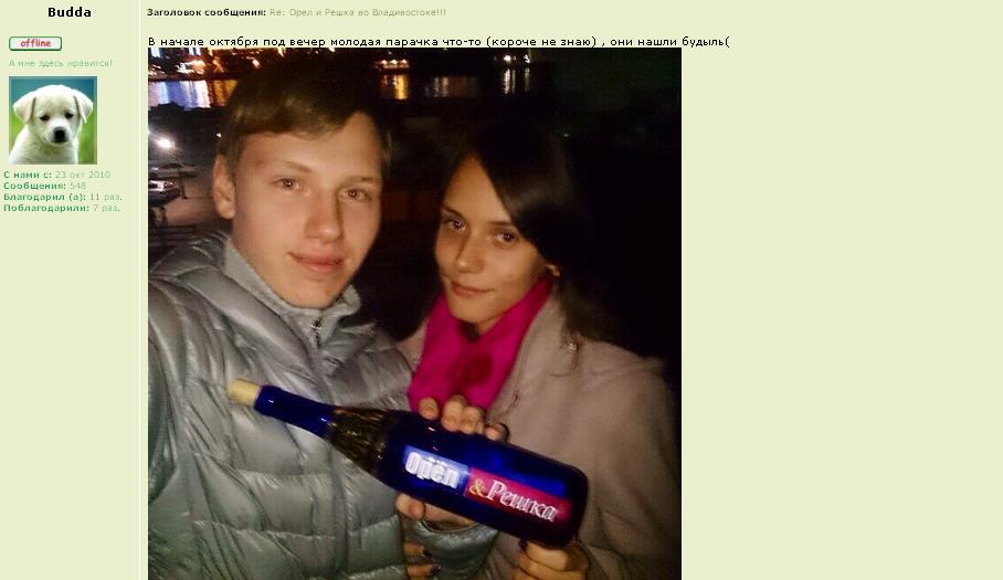 Пока правдивее всего выглядит версия, озвученная на форуме "Владмама", подкрепленная фотографией. Там сказано, что "в начале октября под вечер молодая парочка … они нашли бутыль".