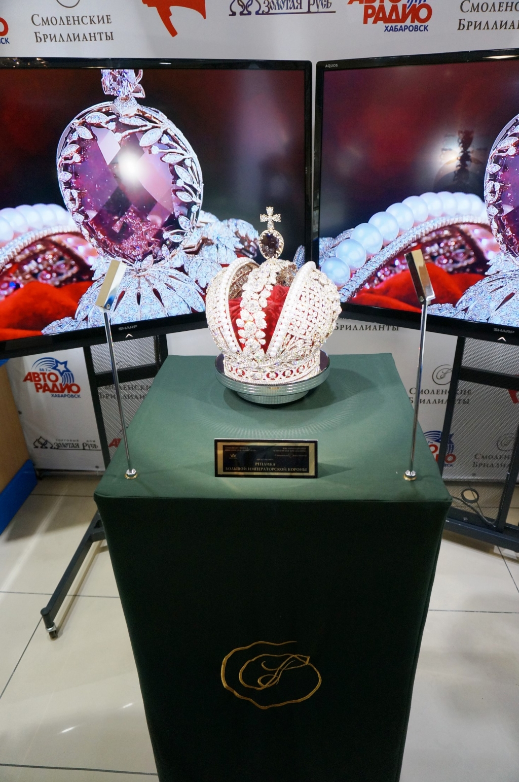 Реплика большой императорской короны, воссозданной смоленскими ювелирами, прибыла в Хабаровск за два дня до 156-летия краевой столицы. Первыми увидеть уникальный экспонат смогли хабаровские журналисты, а также специально приглашенные на презентацию короны гости. Начиная с 30 мая увидеть реплику сможет любой хабаровчанин.