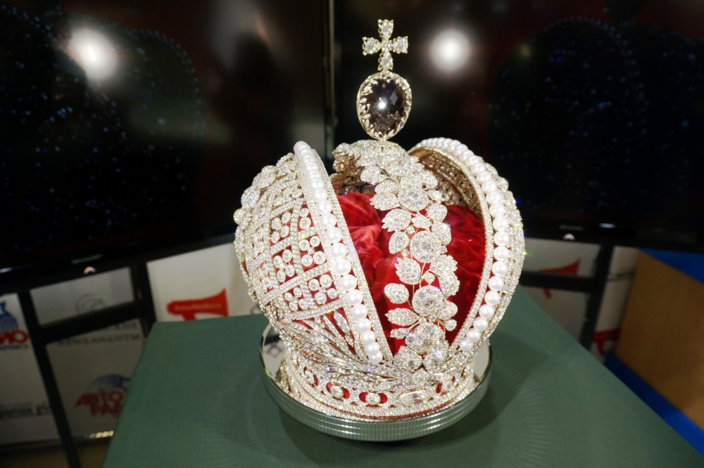 Свое место в уникальной короне нашли более 11 тысяч бриллиантов, почти все они - якутские алмазы. Больше половины бриллиантов (57%) оцениваются как крупные, а центральный камень весит более 10 карат. Венчает воссозданную корону редкий камень рубиново-красного цвета, который ювелиры называют рубеллит. В отличие от оригинала основой реплики является не серебро, а белое золото 585 пробы. Все использованные материалы, кроме морских 54 жемчужин, произведены в России.