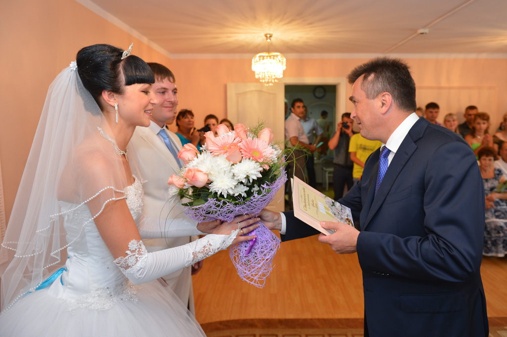 В этот момент здесь проходила свадьба молодой пары. Глава региона поздравил молодоженов с этим важным днем, и вручил им первый совместный документ - свидетельство о браке.
