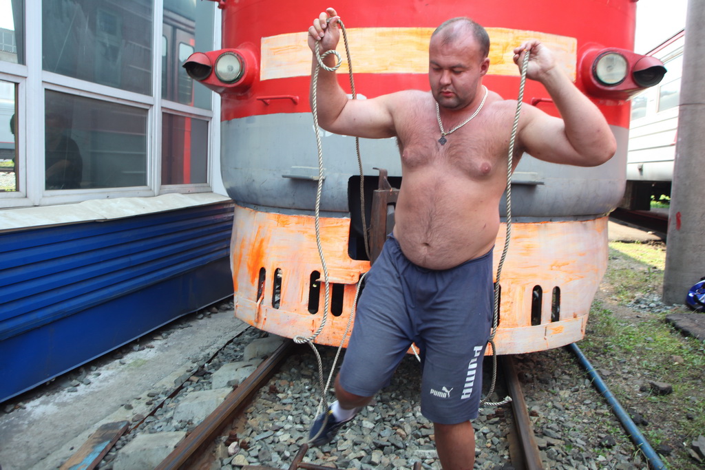 Силач из Владивостока Иван Савкин сдвинул с места четырехсоставный электропоезд весом 188,5 тонн. С третьей попытки спортсмену удалось передвинуть локомотив на 1,5 метра. Мероприятие проходило на территории Дальневосточной дирекции моторвагонного подвижного состава структурного подразделения ТЧМ-7, сообщает корр. РИА PrimaMedia.