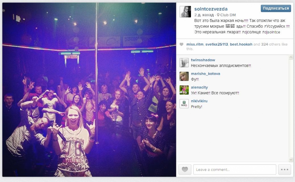 Тем временем фото и видеоотчет о приморских "буднях" Ольги Солнца уже появился в сети Интернет. Судя по фотографиям, Ольга прогулялась по набережным Владивостока. Она сфотографировалась с тигрятами на набережной Спортивной гавани и даже побывала в подводной лодке С-56. Как сообщается на официальной странице фан-клуба диджея, музей открыли специально для посетителей всего-то в первый час ночи. Диджей также выложила в сеть ночные фотографии здания администрации Приморского края и стоящих у причала яхт, сопроводив их комментарием: "Люблю я моря, океаны, речки, да хоть большие лужи, лишь бы в них плавали яхты!"