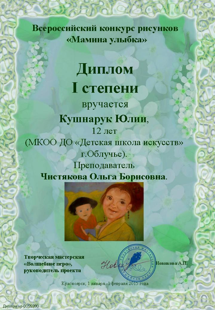Успешным оказалось участие воспитанниц Детской школы искусств г. Облучье ЕАО во Всероссийском интернет-конкурсе "Мамина улыбка". Из четырех представленных работ три получили дипломы первой и второй степеней, сообщает ИА ЕАОmedia со ссылкой на сайт управления культуры правительства ЕАО.