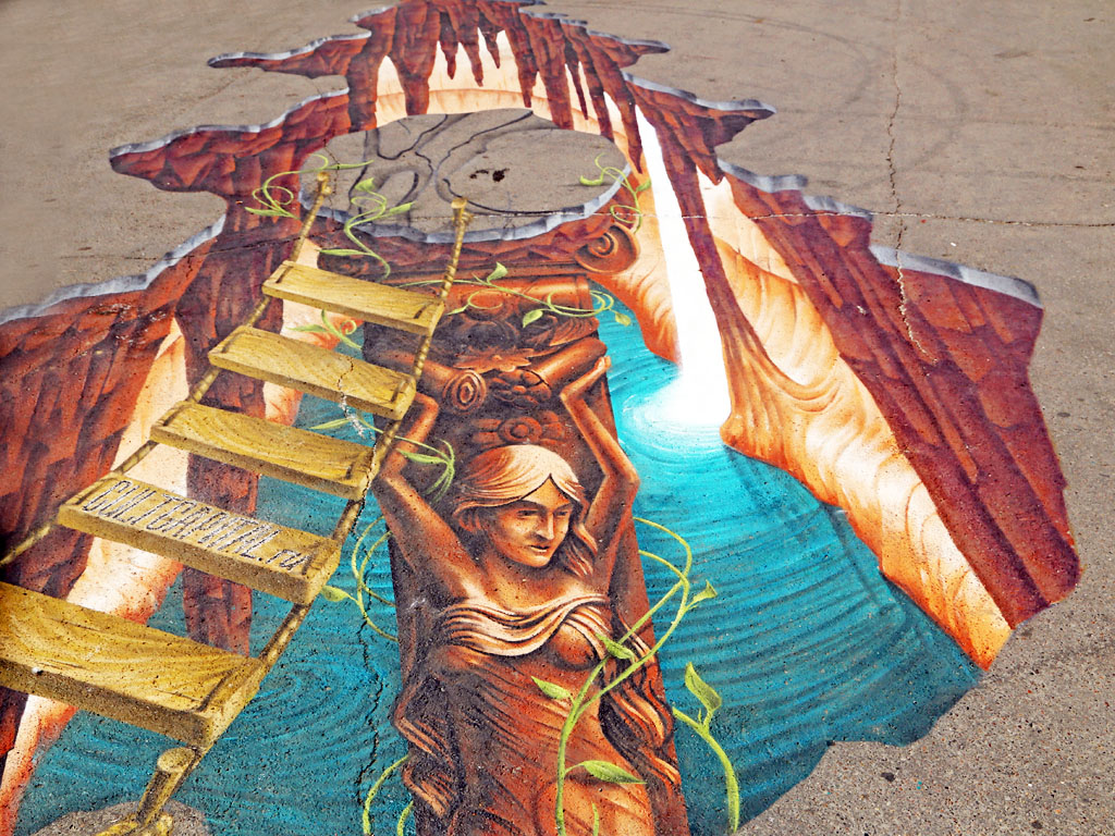 На площади в 40 кв. метров художник изобразил провал — окруженные скалами море и выходящий из воды столб. От края асфальта к этому столбу тянется нарисованная веревочная лестница. Под определенным углом (место обозначено) картина словно оживает, выступают скалы, лестница выглядит настоящей.