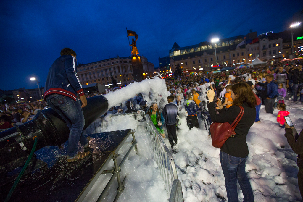 Особо активные горожане с удовольствием барахтались в пене, которую щедро выливал на пятачок перед сценой пенообразователь.