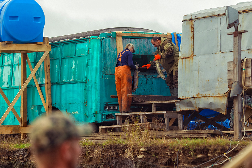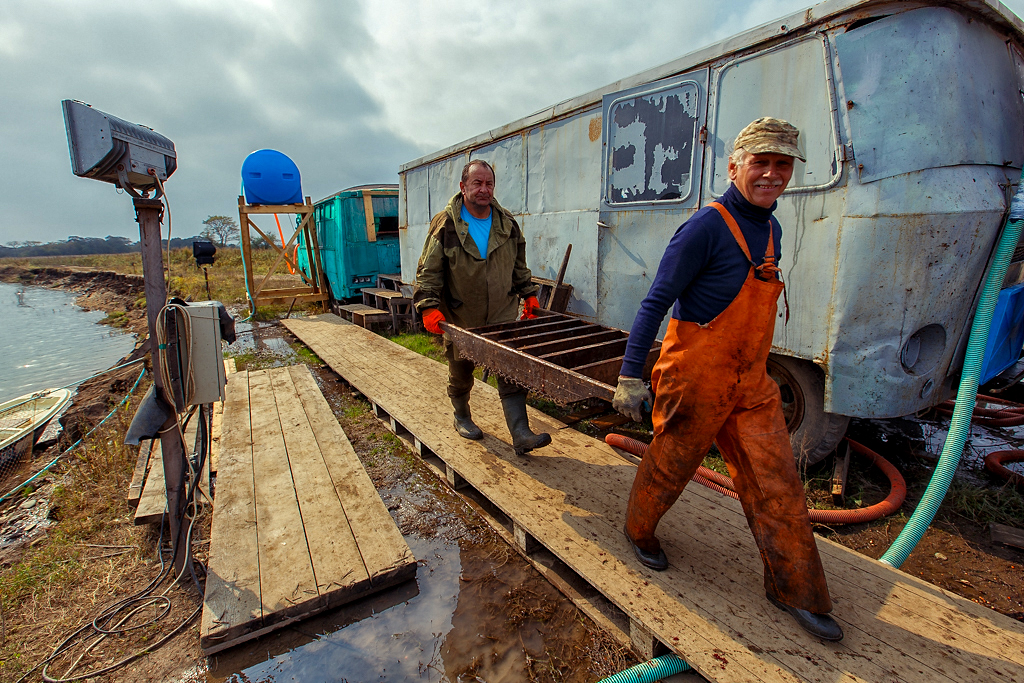На берегу и надводной платформе идет активная работа по заготовке икры. Платформа представляет из себя небольшой помост, под которым располагается садок. В него посредством установленной поперек реки сети, загоняются идущие на нерест производители – самцы и самки кеты в брачном наряде. Вода рядом с пирсом непрерывно бурлит – работают специальные аэраторы, чтобы находящиеся в садке производители не задохнулись.