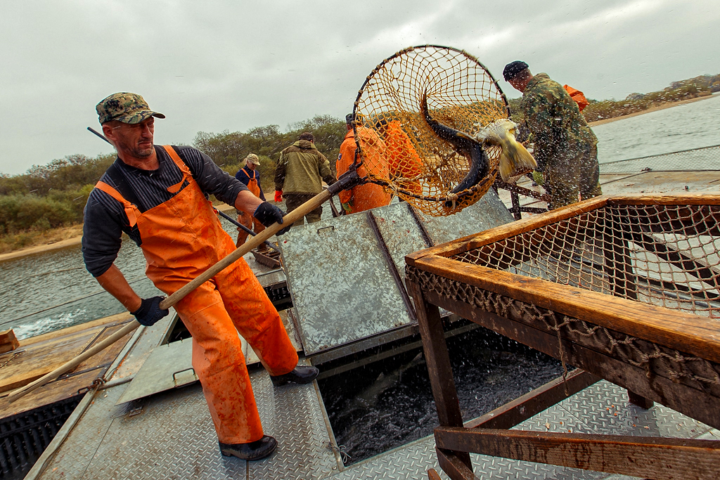 Созревших производителей после оглушения укладывают в специальные носилки. Фото: Фото: РИА PrimaMedia, Александр Хитров