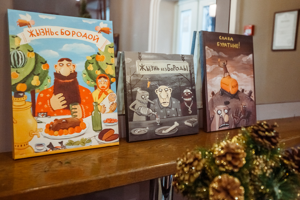 Помимо всевозможных мемов, картин и плакатов, юмор которых поймут, кажется, только те, кто связан с продажами и бизнесом, расположились в зале настольные игры и книги. Нашлось место и для идола пастафарианцев — "иконе" летающего макаронного монстра.