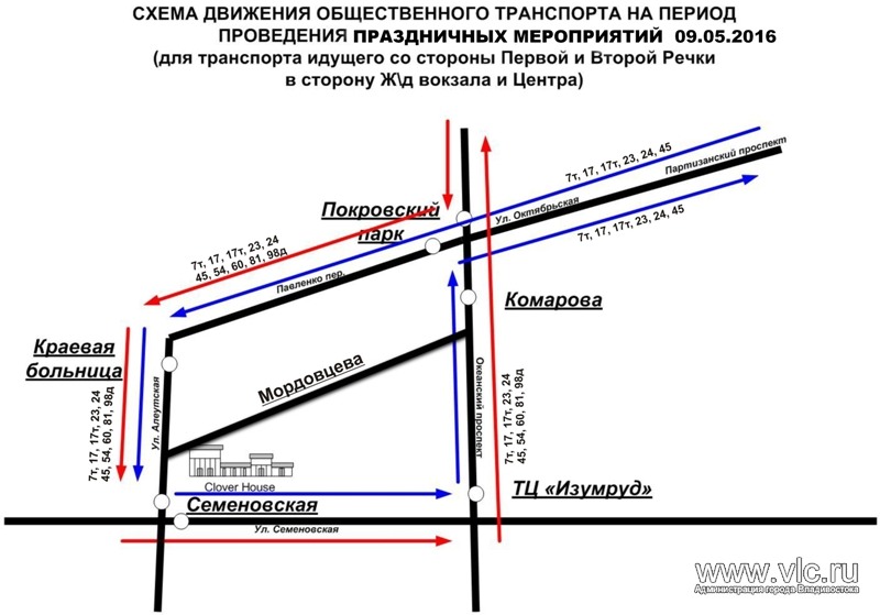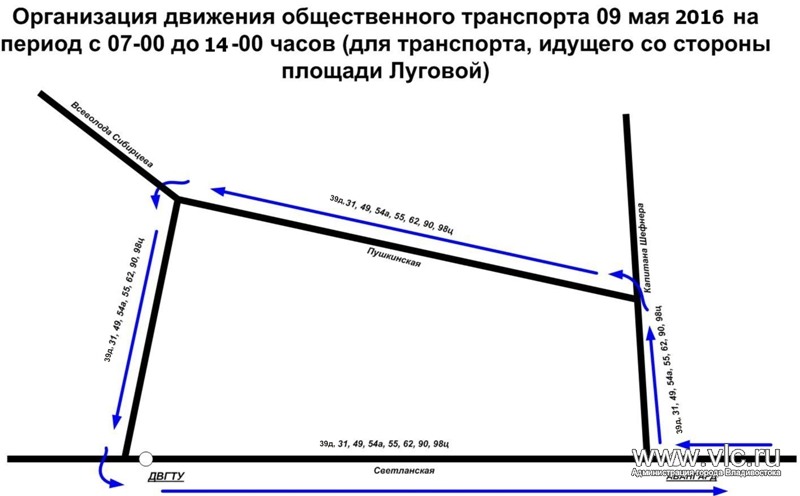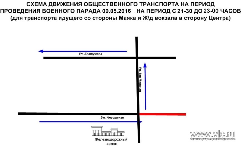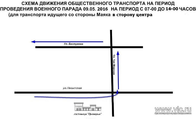 На данные периоды времени 9 мая будет организован объезд по улицам Светланская, 1-я Морская, Набережная, Тигровая, Пограничная, Семеновская, Батарейная, Западная, Суханова, Уборевича, Пушкинская, Всеволода Сибирцева и Луцкого.