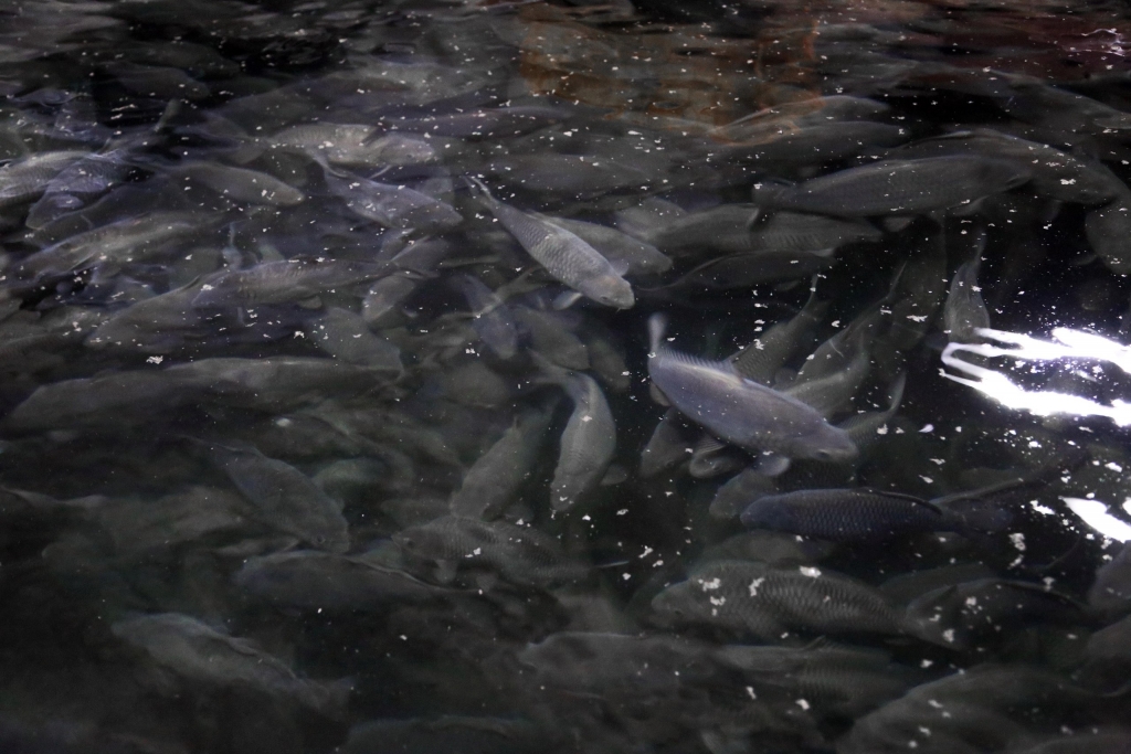 Рыбу здесь выращивают в насыщенной кислородом теплой воде при температуре около 20-ти градусов, что создает благоприятные условия для роста обитателей бассейна.