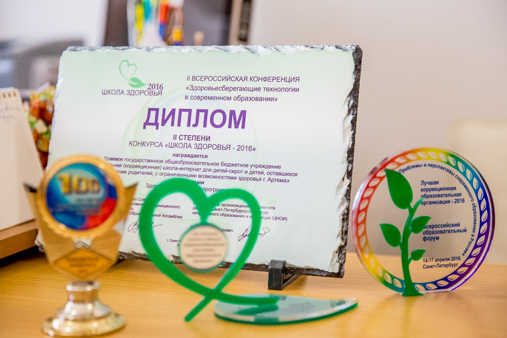 В этом году за программу, направленную на сохранение и укрепление здоровья воспитанников, школа-интернат получила кубок и диплом второй степени федерального конкурса "Школа здоровья-2016", итоги которого подвели в Санкт-Петербурге. Кроме этого, школа-интернат стала лауреатом всероссийского конкурса "Лучшая коррекционная образовательная организация 2016". Также по результатам исследования международной академии общественного признания она стала "Ведущей коррекционной образовательной школой-интернатом России". Вручение награды пройдет в Москве 10 июня, в торжественной церемонии примут участие депутаты Государственной Думы, Герои России (СССР), известные и заслуженные деятели культуры.