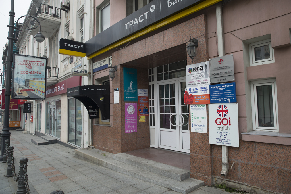 Также доступными для инвалидов оказались офисы "Алмазэргиэнбанк", "Альфабанка" и "Восточного банка". "Банк Открытие" поступил интереснее всего – около лестницы прикручены полозья пандуса, которые можно опустить. Правда, для этого надо найти кого-то с ключом от замка, удерживающего конструкцию в вертикальном положении. "Банк Приморье" — почти доступен. Пандуса у него нет, но порог очень низкий, так что трудностей у инвалидов скорее всего не возникнет.