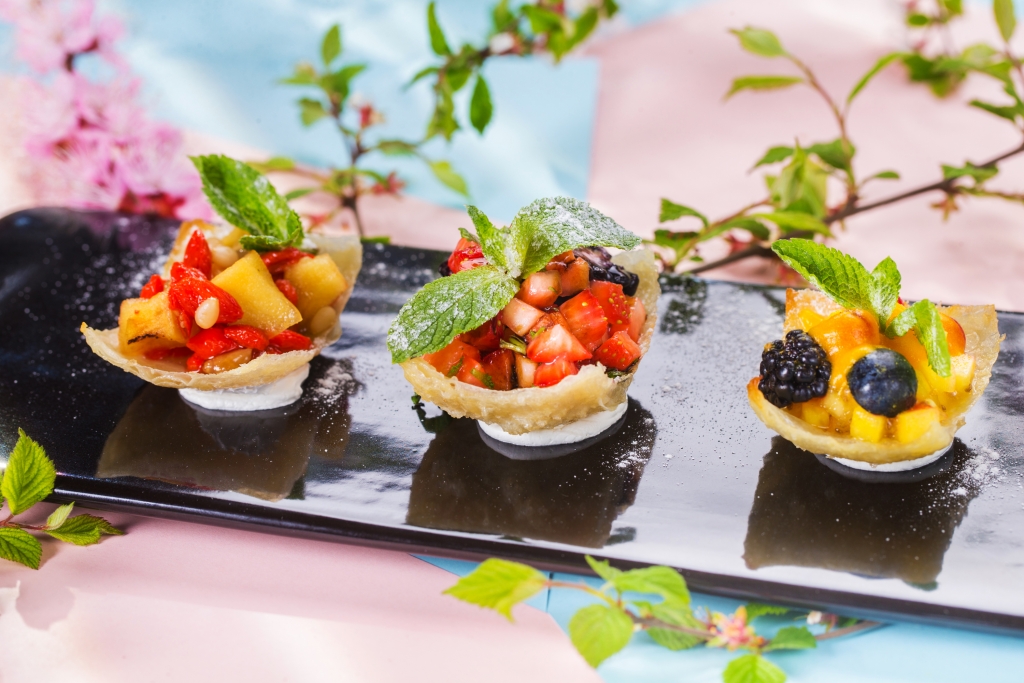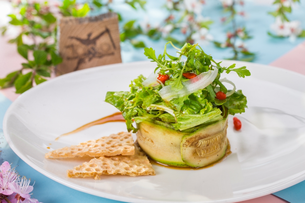 здесь и интерпретация средиземноморского салата с домашним сыром; нежный тар-тар из лосося в хрустящих корзинках из теста фило с добавлением авокадо, каперсов и клубники; сочные рулеты из говядины, фаршированные курагой и черносливом — с лапшой из цукини и острым соусом, и, конечно, новые десерты, например, микс из трех фруктово-ягодных салатов с добавлением кедровых орешков в корзинках из легкого слоеного теста фило.