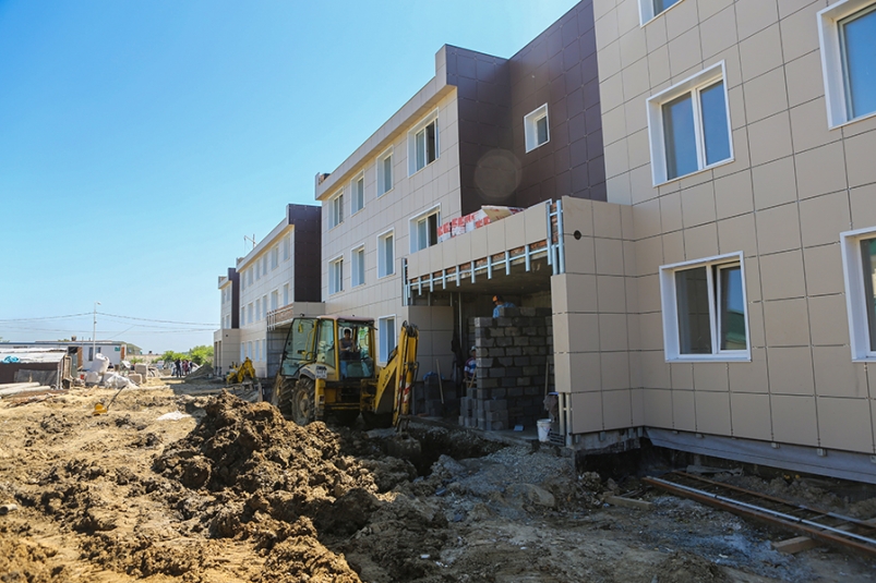 "Мы завершили монтаж оконных блоков, выполнено 50% фасадных работ, в том числе облицовка керамогранитом. Выполнено утепление кровли и приступили к её гидроизоляции. Продолжаются наружные работы по устройству сетей канализации, дренажа, сетей ливневой канализации. Внутри здания завершены штукатурные работы, начался монтаж дверных коробок, укладка плиток в санузлах", — рассказал прораб Валерий Томилин.