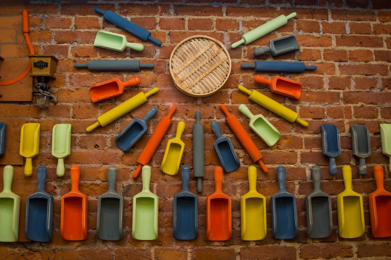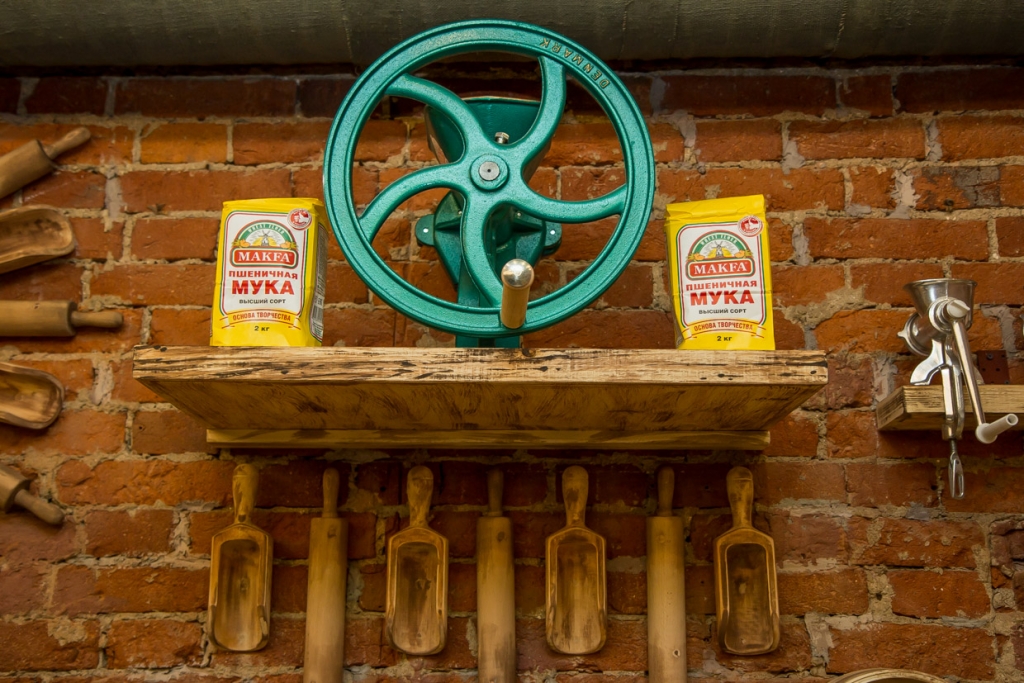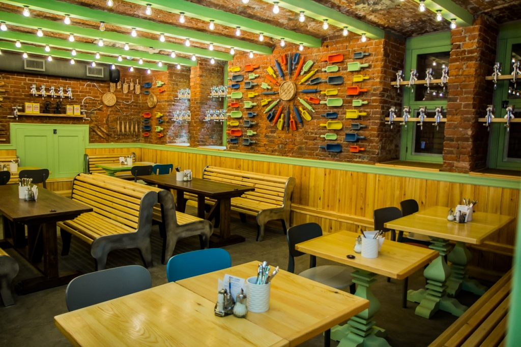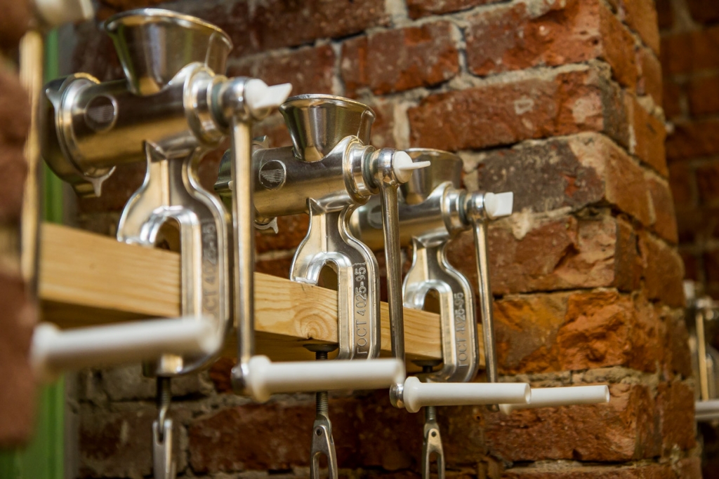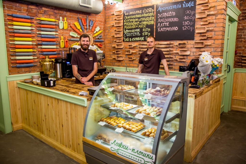 В извилистом зале я ищу маркетолога пельменной Марго Шишкову, с которой у нас назначена встреча в честь открытия заведения (пельменная "Ложки-Пложки" открылась в пятницу, 9 июля), в это же время я замечаю как минимум три источника того самого приятного микса ароматов. Сразу на входе – самовар и пирожки на витрине (их можно купить на вынос), чуть дальше – с десяток новеньких совков, развешанных на стенах в качестве декора и источающих аромат свежеспиленного дерева. Вижу, как повар выносит из кухни только что приготовленные булочки и выкладывает их на открытой кухне-баре.