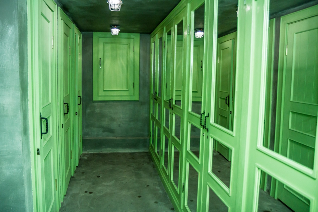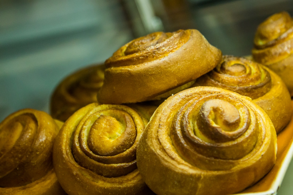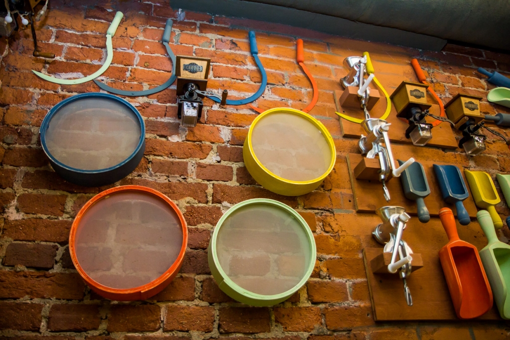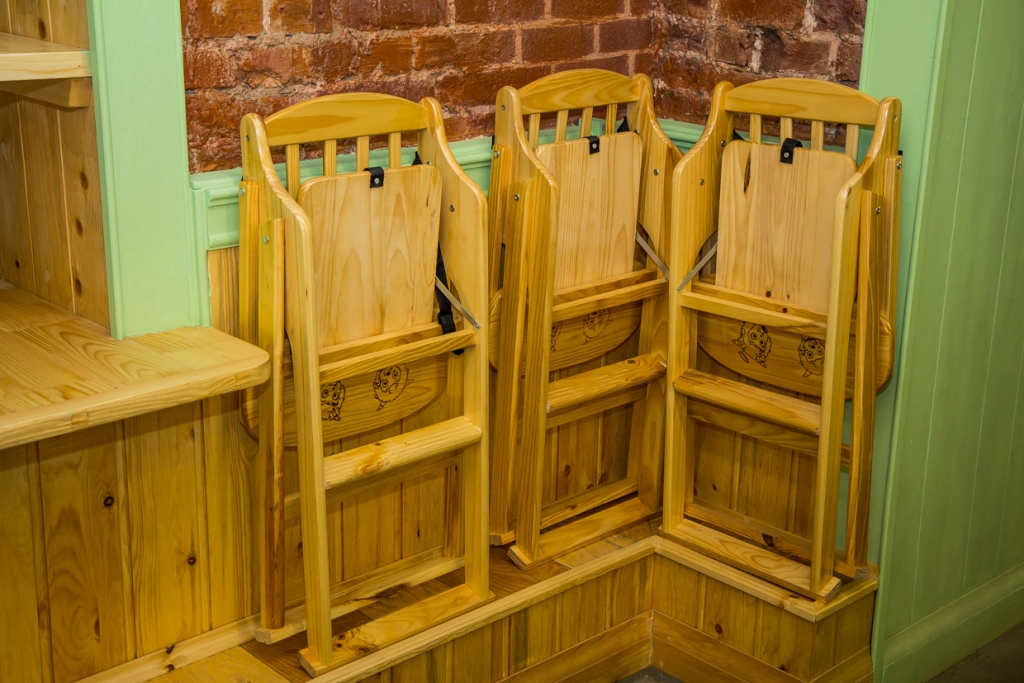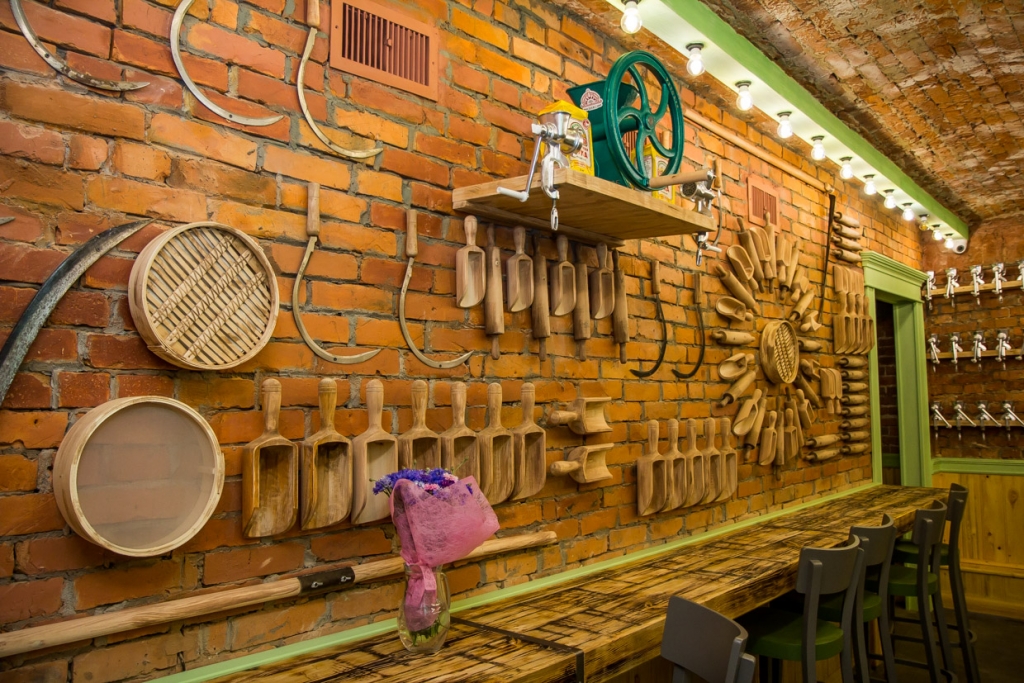 В извилистом зале я ищу маркетолога пельменной Марго Шишкову, с которой у нас назначена встреча в честь открытия заведения (пельменная "Ложки-Пложки" открылась в пятницу, 9 июля), в это же время я замечаю как минимум три источника того самого приятного микса ароматов. Сразу на входе – самовар и пирожки на витрине (их можно купить на вынос), чуть дальше – с десяток новеньких совков, развешанных на стенах в качестве декора и источающих аромат свежеспиленного дерева. Вижу, как повар выносит из кухни только что приготовленные булочки и выкладывает их на открытой кухне-баре.