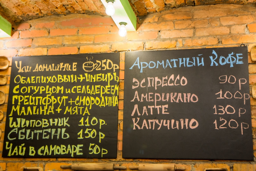 Чаи здесь – без капли сиропа, а варенья – только собственного производства. Из чего я делаю вывод, что ребята серьезно заморачиваются. В это же время смотрю на ценник: лимонад "малина – мята" или облепиховый с имбирем 350 мл — 160 рублей; 1 л – 350 рублей. Морс облепиховый, ягодный 250 мл – 80 рублей; 1 л – 350 рублей. Чай (типа Ассама, пуэра, улуна, фруктового пунша) – 120 рублей, старинный восточнославянский напиток сбитень – 150, а чай из самовара вообще – 50.