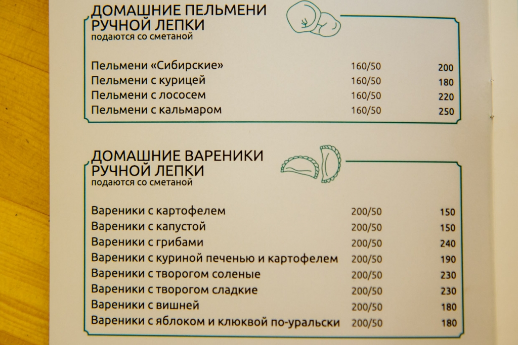 — Замороженные пельмени, вареники и кундюмы можно взять на вынос – по 0,5 кг, стоимостью от 200 до 400 рублей, в зависимости от начинки.