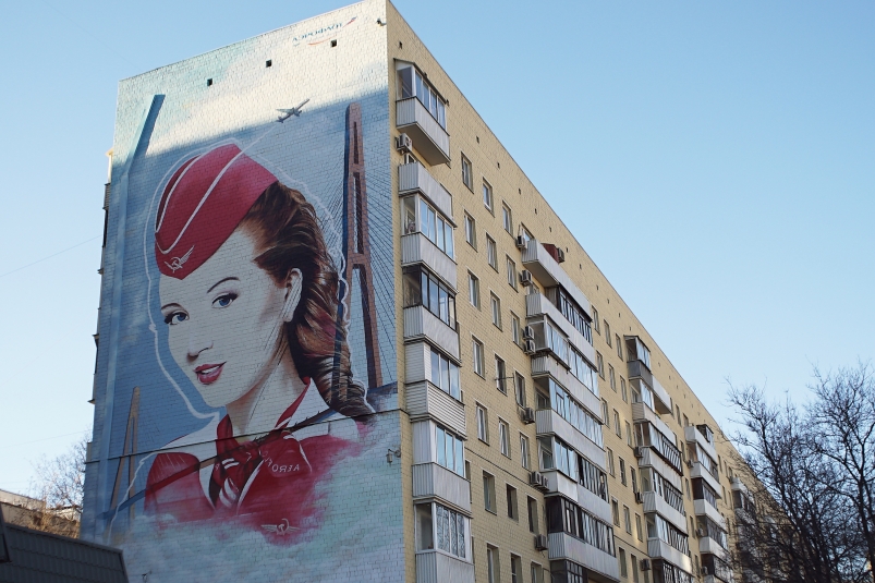 Большой рисунок с портретом стюардессы авиакомпании "Аэрофлот"на форе Русского моста находится на Ленинградском шоссе, 9/1. Над девушкой пролетает самолет, а в самом низу граффити написано "Владивосток". Серия граффити с изображением городов России появилась в 2015 году при сотрудничестве "Аэрофлота" и проекта "Артфасад", который занимается созданием патриотических граффити. Художники "Артфасада" также нарисовали стюардесс на фоне главных достопримечательностей Сочи, Санкт-Петербурга, Калининграда, Казани и Ростова-на-Дону.