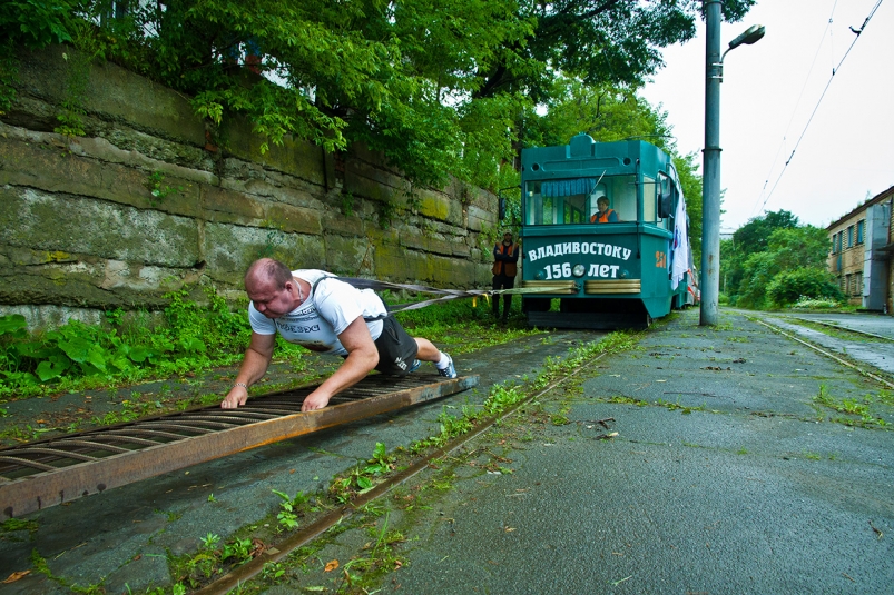 Приморский силач Иван Савкин с третьей попытки смог сдвинуть с места пять трамваев общей массой около 100 тонн. Он протащил их на метр. Свой личный рекорд Савкин посвятил астрологу Евгению Зеленику и бывшей первой леди края Ларисе Беловровой, сообщает РИА PrimaMedia.