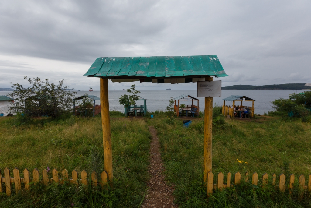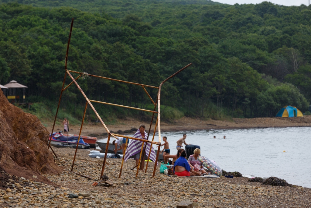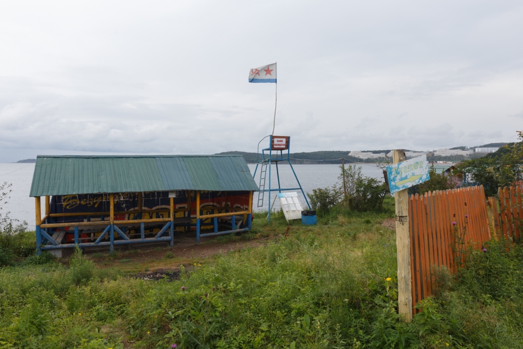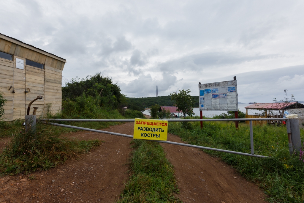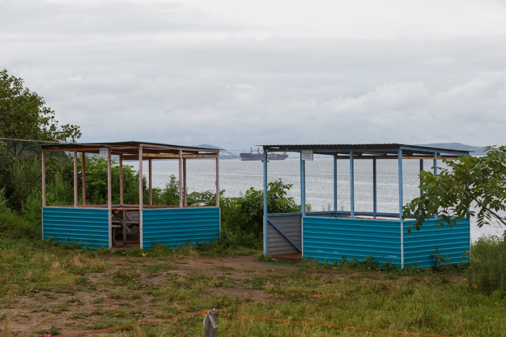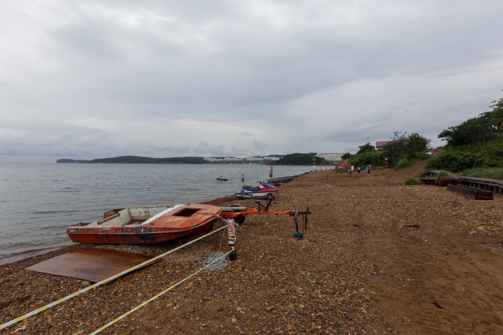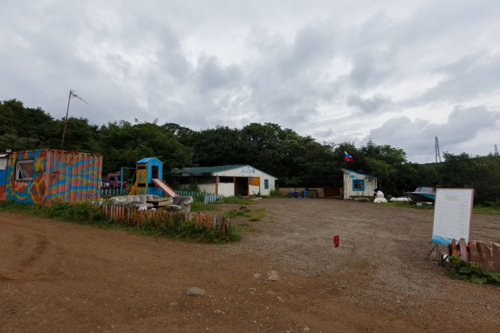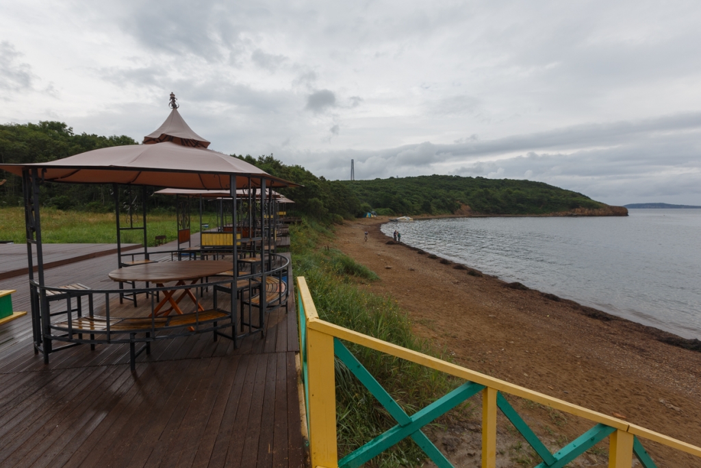 Любители ночевок на берегу моря могут оставить свою палатку до утра за 300 рублей (кроме 100 рублей за въезд). Другие плюсы: специально отведенное место для курящих и вид на Уссурийский залив и кампус ДВФУ. Другие минусы: прямо на берегу, судя по всему, уже давно лежит большая металлическая конструкция. Недалеко от пляжа бухту бороздят крупные суда, которые сбрасывают в воду пустые бочки из-под топлива.