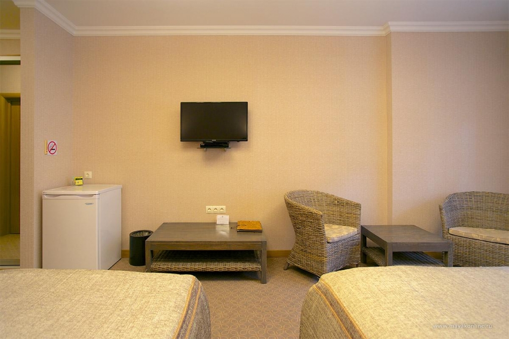 Но, как правило, отдыхающие предпочитают для спокойного отдыха места более уединенные, чем гостиница. Поэтому "Маяк" выбрал совмещенный вариант строительства: одно большое здание и несколько отдельных. На разные предпочтения отдыхающих. Например, номера в коттеджах отличаются от гостиничных,что в них есть зона мини-кухни с микроволновой печью, раковиной и набором посуды.