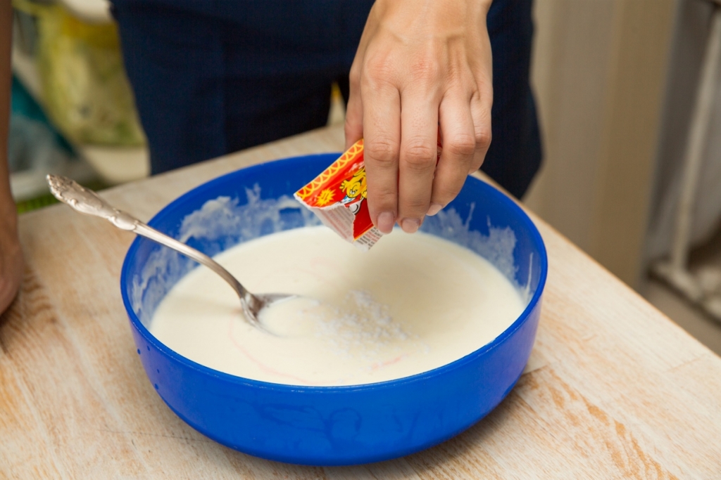 Яйца взбиваем с сахаром, добавляем сметану и тщательно перемешиваем. Пол чайной ложки соды гасим уксусом (можно винным) и добавляем в тесто. Небольшими порциями добавляем муку, тщательно перемешивая, и немного ванилина.