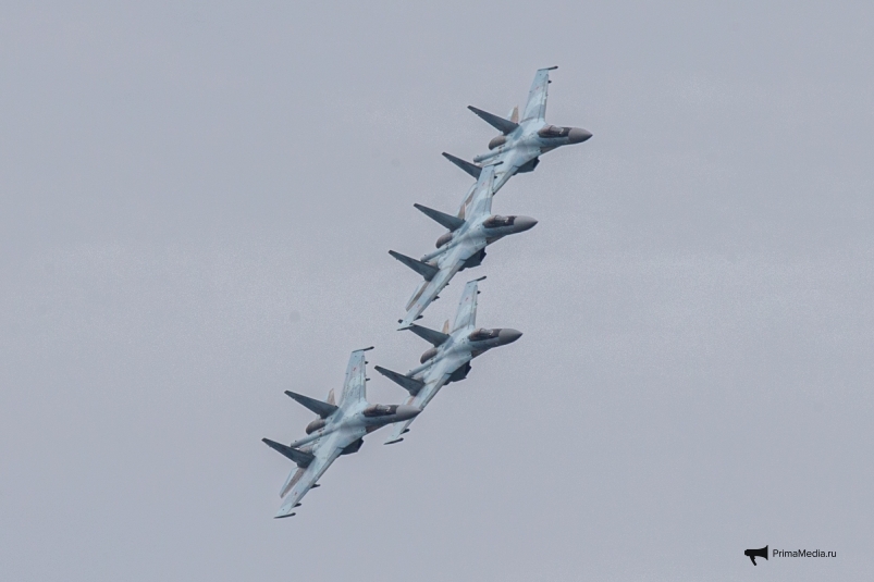 Пилотажной группой командовал гвардии полковник Андрей Алексеев. Авиаторы поднялись в воздух на четырех многофункциональных сверхманевренных истребителях Су-35С истребительного авиационного полка армии ВВС и ПВО Восточного военного округа. Группа продемонстрировала многочисленным зрителям фигуры высшего пилотажа, пролеты в составе различных строев и элементы воздушного боя.